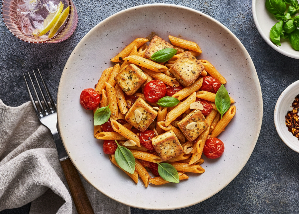 Penne tossed with golden-seared basilico tofu, cherry tomatoes and garlic in a light olive oil sauce, finished with fresh basil and cracked black pepper. Fresh, fragrant, and effortlessly comforting.